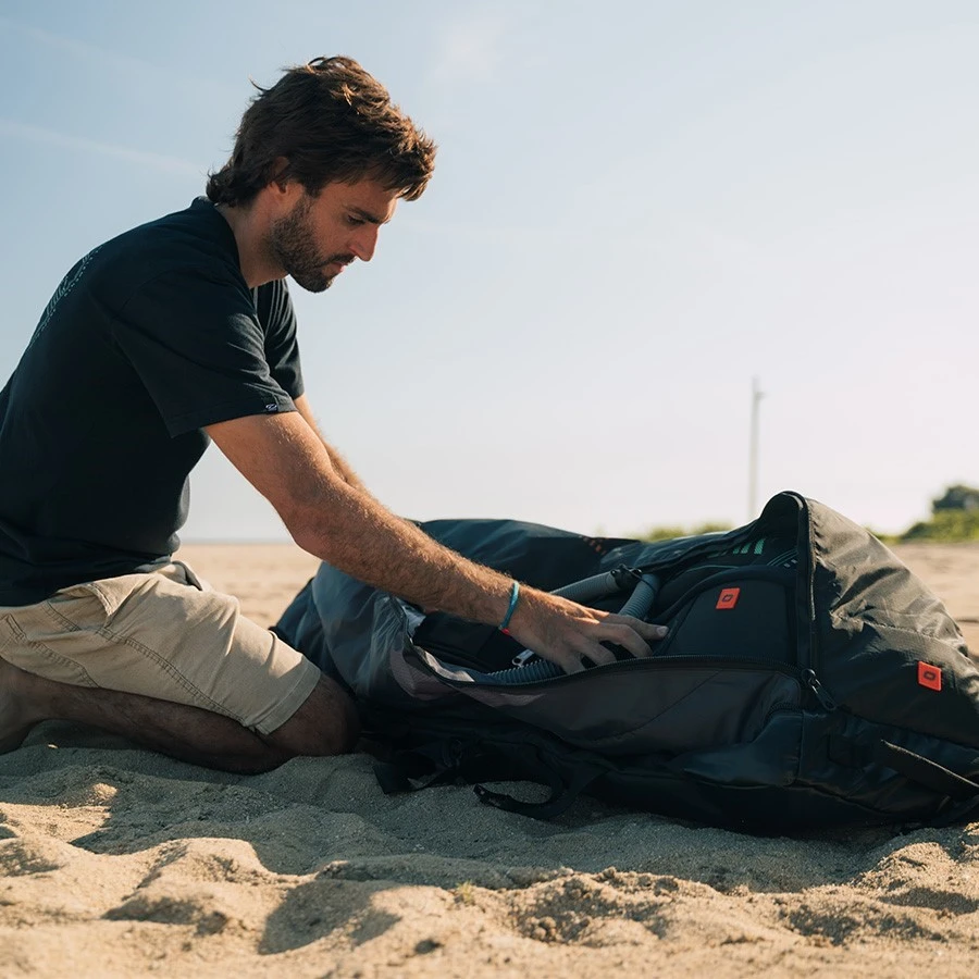 - The zip pocket inside the top compartment keeps your fins and screws safe if you decide to remove them on long hauls. An external zip pocket with windows makes it easy to access travel documents, maps or your wind-meter without having to open the main bag.