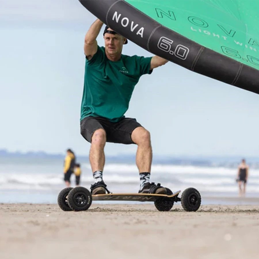 Hone your wing or kite skills without getting your feet wet. The North Dune combines the best elements of skate, snow and all-terrain mountainboarding (ATB) with the versatile windpower of a wing or kite. Ideal for use on sand, dirt, grass or pavement, our new off-road landboard’s long deck, wide trucks and large wheels provide stability on rough terrain. Strong oversized bearings provide excellent side-loadbearing for cruising the flats or mastering airs and tricks. 10.5″ trucks withstand anything you can throw down, giving you stability at high speeds with great carving.