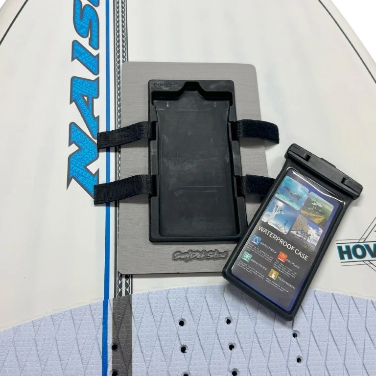 It Happens, and when it does, SurfDek is there. A bad day, a blown wing, broken paddle, or the wind just plain stops. The Deck Phone Storage is Large enough to hold a cellphone, some cash, or a credit card. It is the always there, just in case solution. Universal adhesive waterproof pouch for mobile phone up to 7″ and other accessories such as small tech, money, keys, passport and bank cards. Secure tray with velcro attachments along with removable dry bag/mobile phone pouch for use on any board surface with a large flat area. Perfect wingboards, paddle boards (SUPs), canoes, kayaks etc.