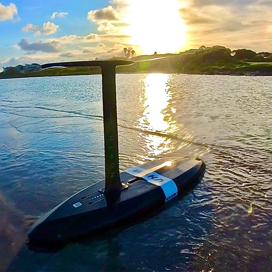 Tapered Tail – The tail design transitions from a stable, flatter center surface that provides essential user stability into a progressive taper that culminates in a refined pin tail. This sophisticated geometry efficiently reduces wetted surface area and minimizes drag. As the board generates lift, the precision-engineered pin tail ensures clean release from surface tension, enhancing overall efficiency and control during powered riding.